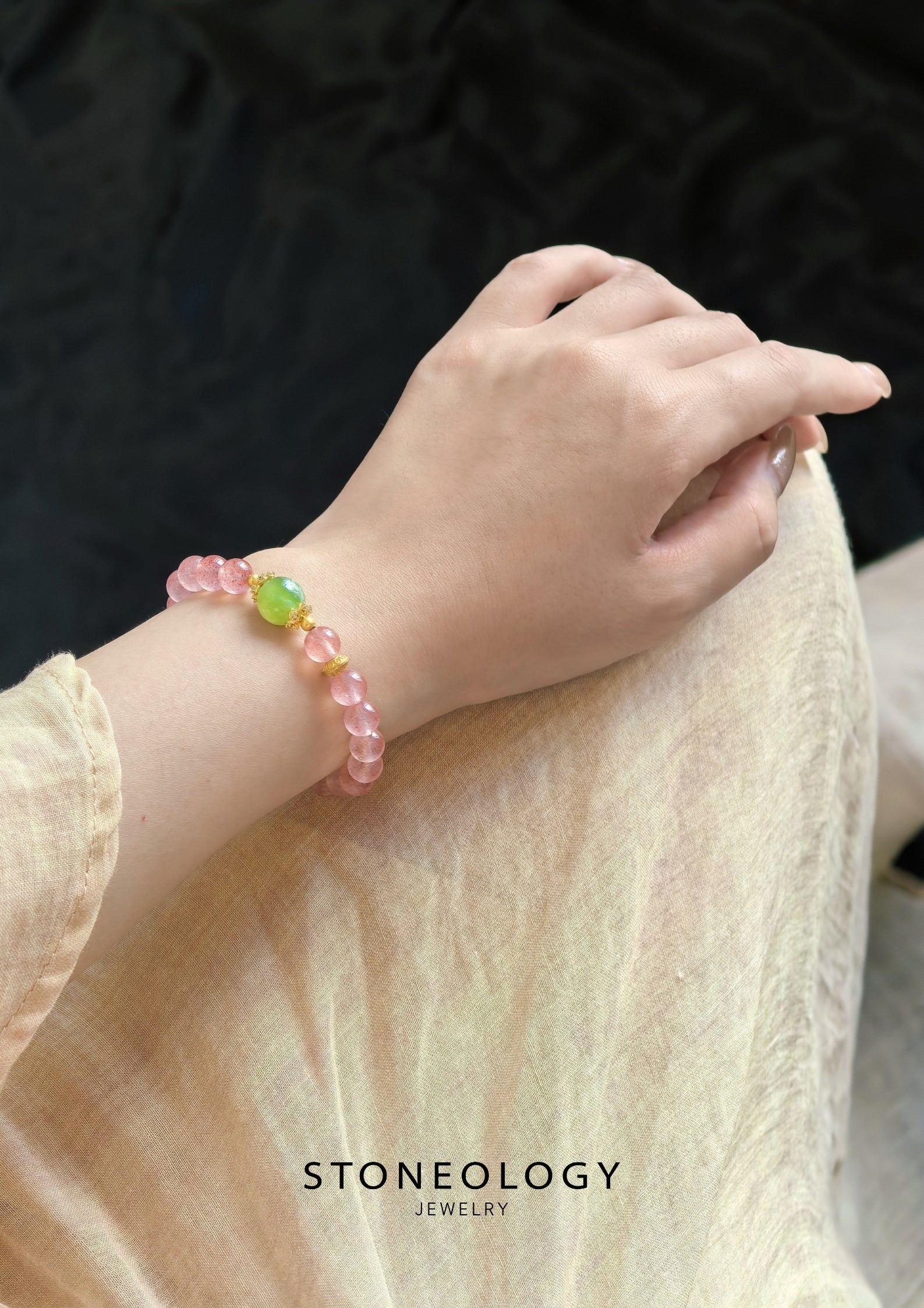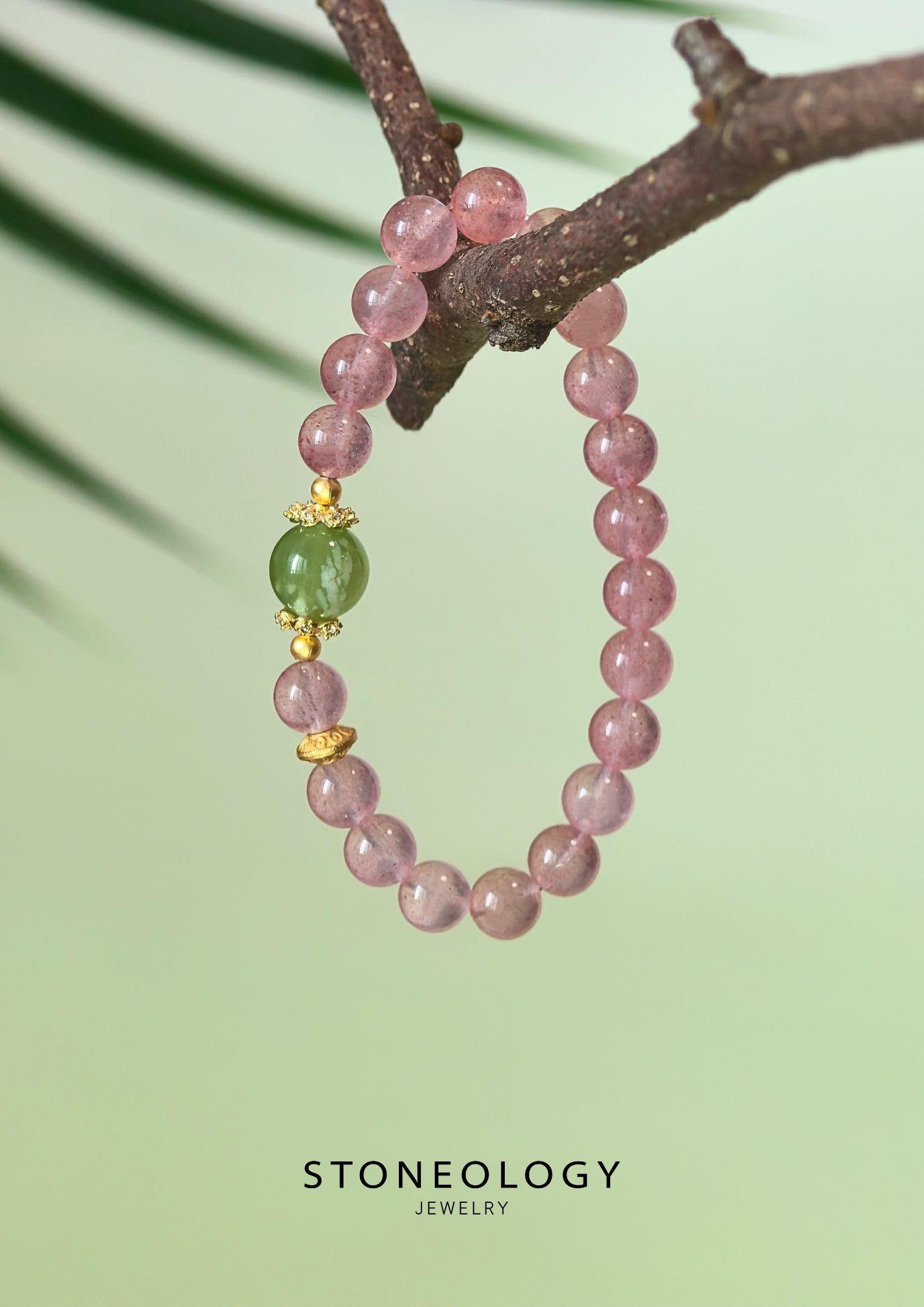 With dreamy pink strawberry quartz as its soul, the crystal is dotted with berry-like speckles, like sweet smiles of spring. The jade-green beads resemble fresh sprouts, beautifully paired with gold-plated floral settings. Copper-gilded details add elegance. Perfect for daily wear or dates, it adds a touch of playful charm and grace to every moment.