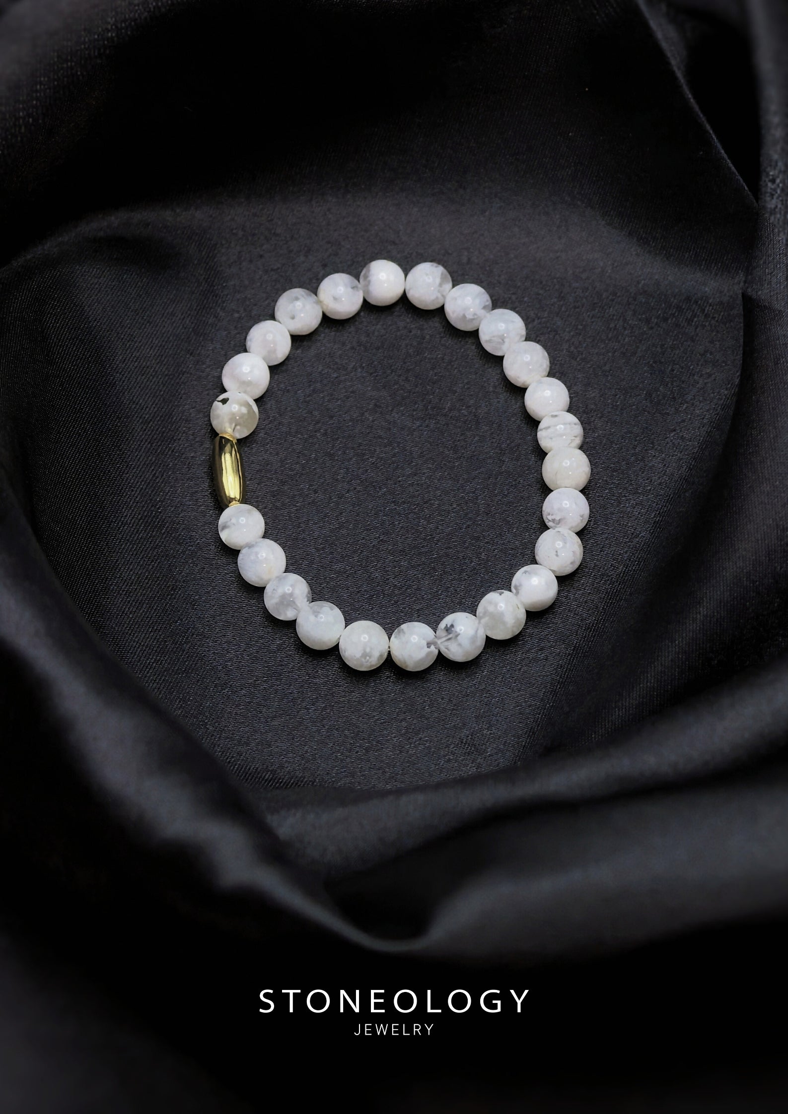 This bracelet captures the ethereal beauty of Snowstorm Phantom Quartz, a rare variant of white crystal, as if freezing a breathtaking blizzard upon your wrist. Its intricate white veining mirrors life’s storms, while the bold titanium steel accents embody resilience—seamlessly blending elegance with strength.