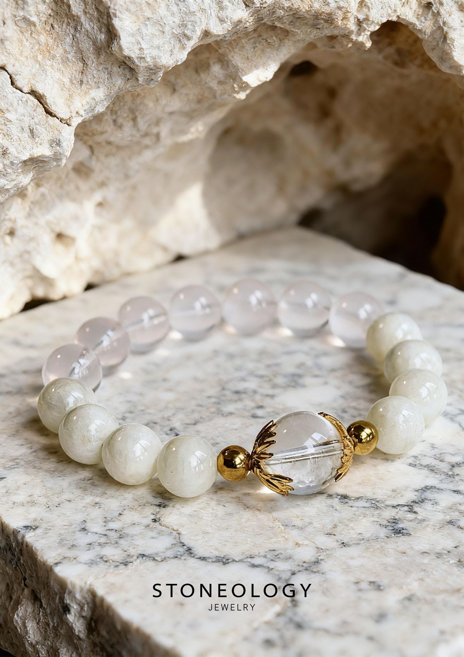 Crafted with white milky quartz and white phantom crystals, this bracelet captures the soft glow of a sunlit shore. Accented with warm gold tones, it adds effortless elegance to your resort-style wardrobe. The perfect touch to elevate any light summer ensemble.