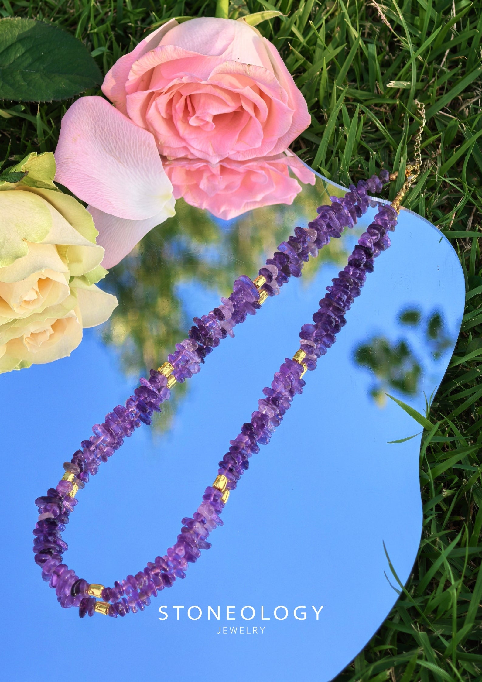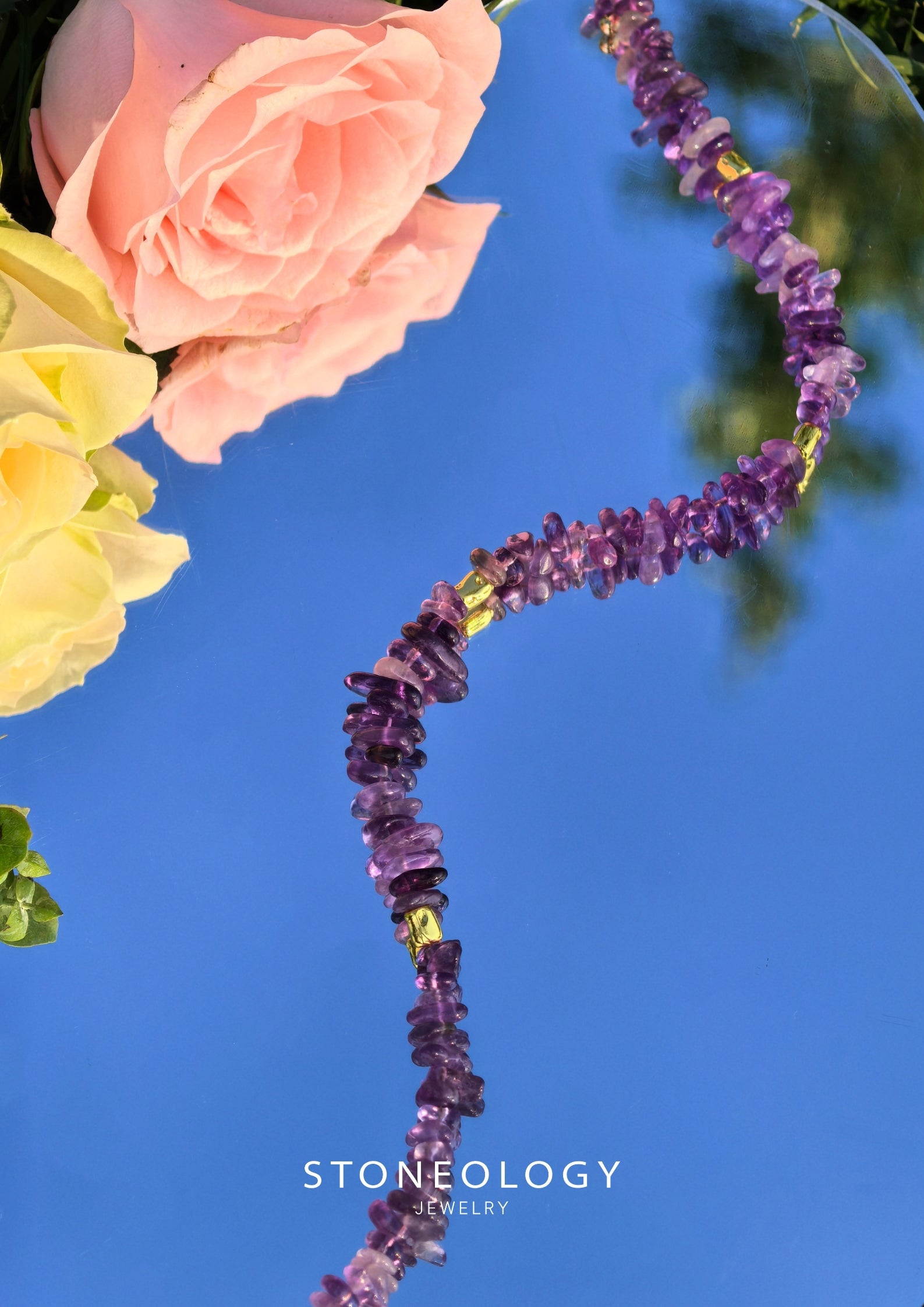 "Purple Aurora" – A dance of shimmering amethyst stones, arranged like the magical glow of the Northern Lights. A love letter from the cosmos to Earth. Each natural crystal fragment is like a fallen piece of the aurora, carrying the whisper of the stars and the breath of the Arctic. Wear it, and you carry the ethereal glow of the lights with you.